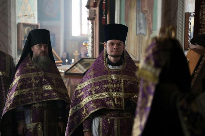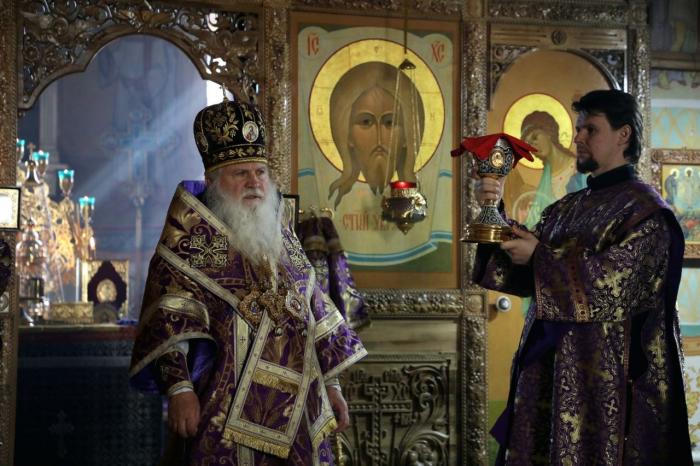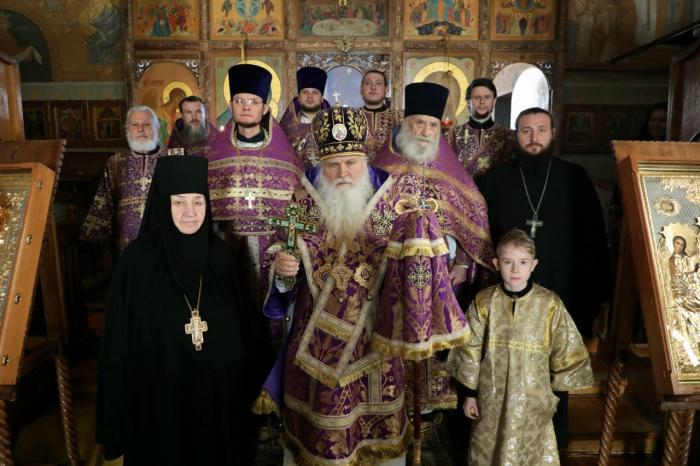 Его Высокопреосвященству сослужили: протоиерей Иоанн Кулешов, иерей Димитрий Хабаров, иерей Игорь Сладков, иеромонах Мефодий (Абдусаидов), диакон Петр Гнатик, диакон Тимофей Балухатин, иеродиакон Тихон (Баймурадов).